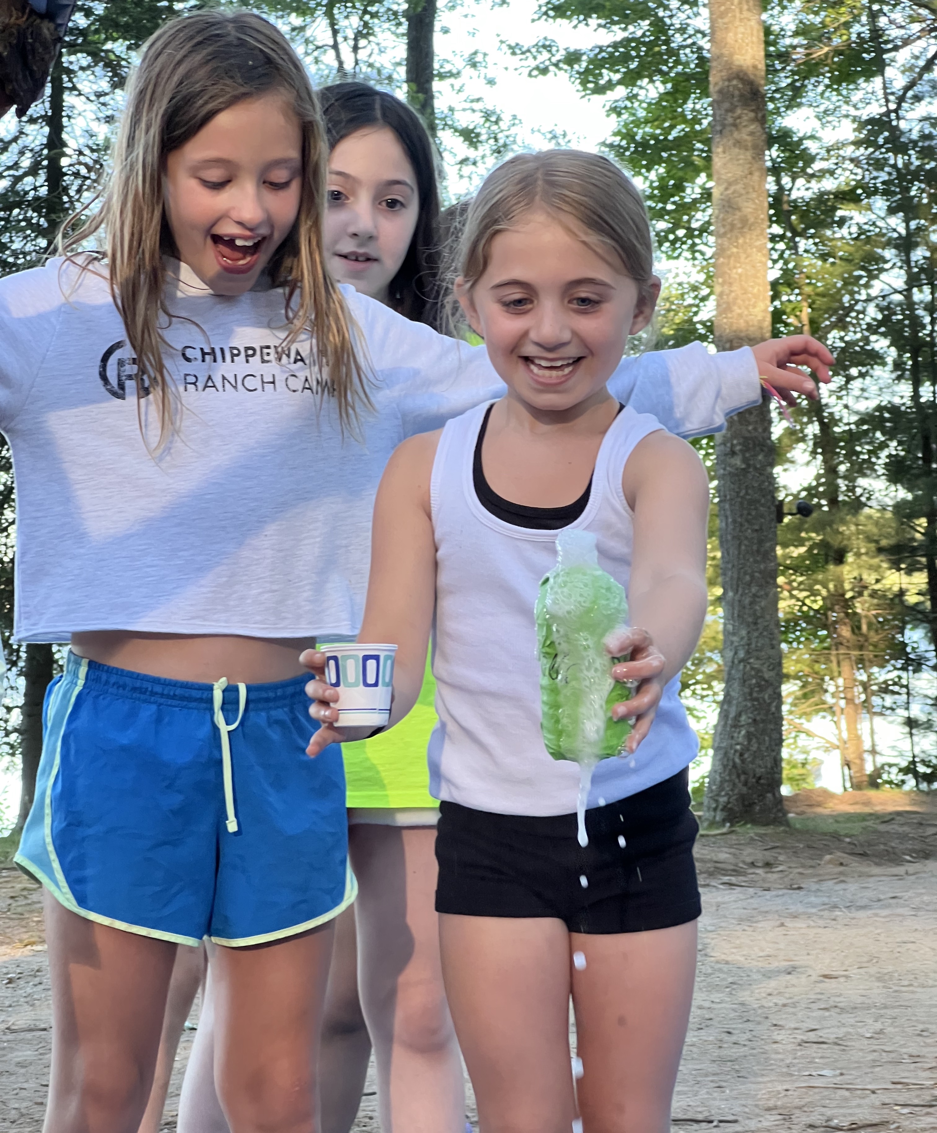 And then we had a delicious Taco Tuesday dinner followed by the big Tan & White reveal. We all gathered around the Center Fire Circle to watch as all new campers lined up to find out which team they will forever be connected to. And the reveal was awesome…each camper got a small water bottle and a little cup of vinegar. They poured the vinegar into the water bottle and the bottle exploded with either white or red…it was fun to watch, and this science experiment (known as Elephant Toothpaste) was an amazing way for the newest Chippies to learn their teams.