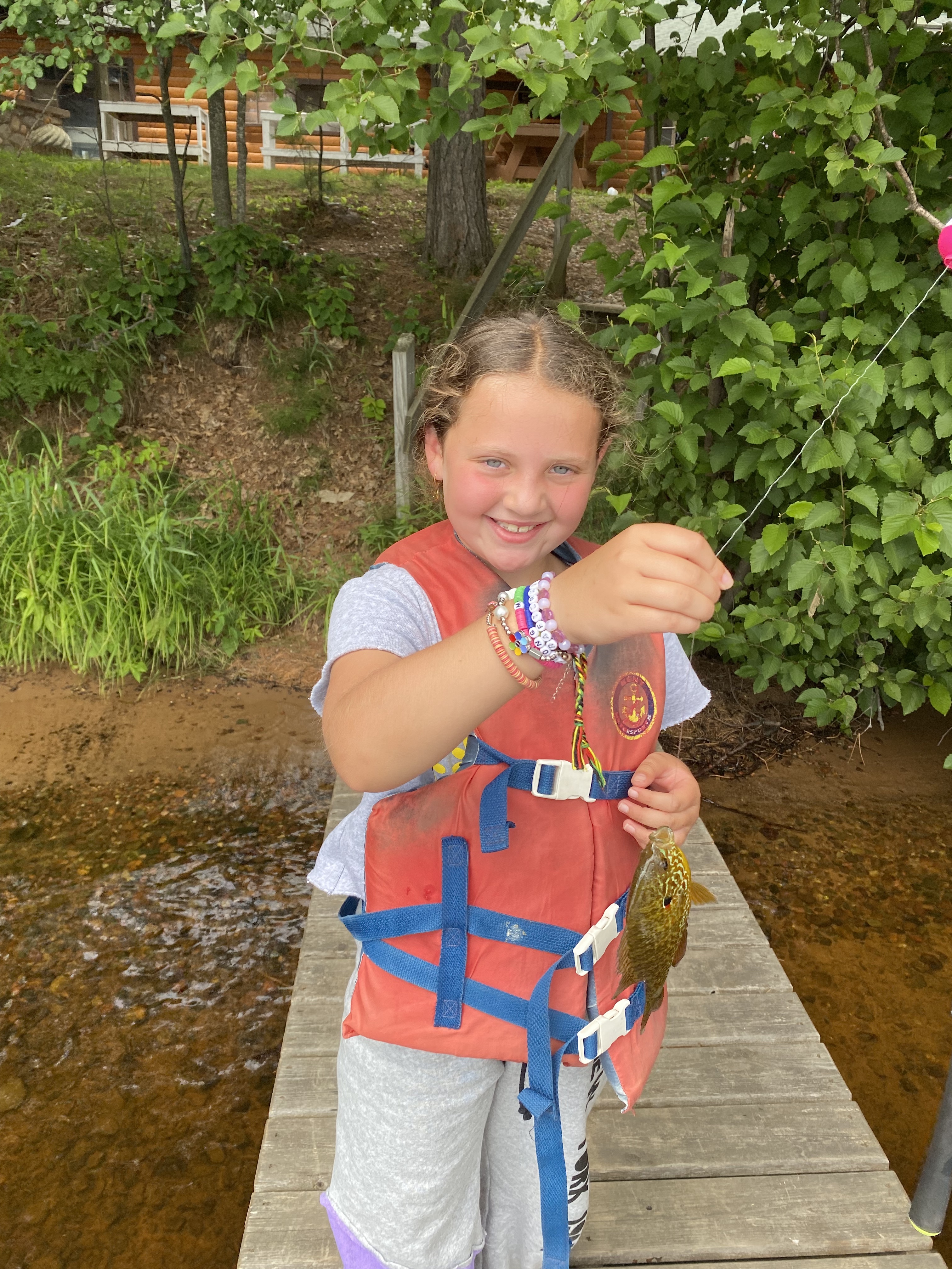 After a thirty minute sleep-in, we had a wonderful breakfast (breakfast tacos), an excellent cabin clean-up and then we got straight into activities. Down at the fishing docks, Maddie J caught a blue gill, which was very exciting! And at skiing, Emma S dropped a ski & crossed the wakes, and Chloe M lifted a ski! This morning at swimming, Sydney B went on the blob for the first time, and absolutely loved it. The smile plastered across her face was priceless! At cooking, they made blueberry wonton cups. Kayla Z told me that she was IAing in cooking, and explained that it was so fun to help the younger campers preparing the ingredients. That’s one of the many things I love about this place- older campers around here genuinely take an interest in the younger campers, and the positive impact it has on those youngers is huge…it makes a legitimate difference in their summers to have older campers as kind and fun role models.