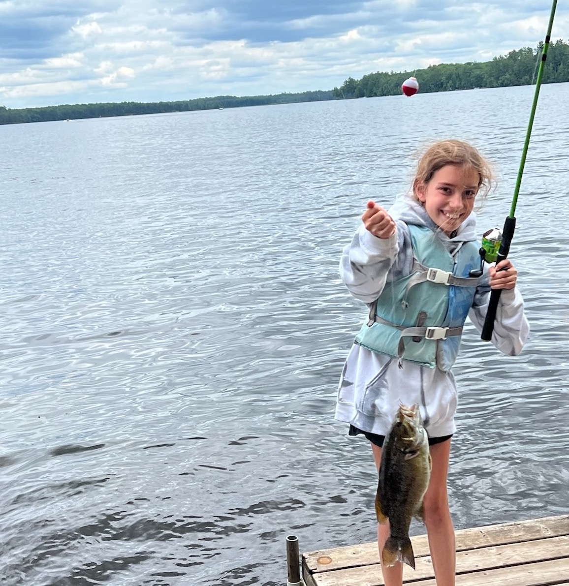 As the day moved on, we enjoyed our first day of second sign-up A-Day Activities! At outdoor cooking, campers made S’moreos and at indoor cooking, campers made oatmeal butterscotch cookies. I was lucky enough to try both, and they were delicious! At skiing, Billie S got up for ten seconds, Chloe M got up and around the lake on two skis and Mikki L dropped for ten seconds. And at fishing, Willow K, Annie F and Skye N all caught fish…Annie’s was huge- possibly the biggest fish I have ever seen caught on Dam Lake! When I stopped by painting, I could not believe the talent in the room…there were both Colt and Wrangler Village campers at the painting table creating beautiful evening landscapes. They were excited to show off their art-work and I was so impressed as I browsed each canvas.