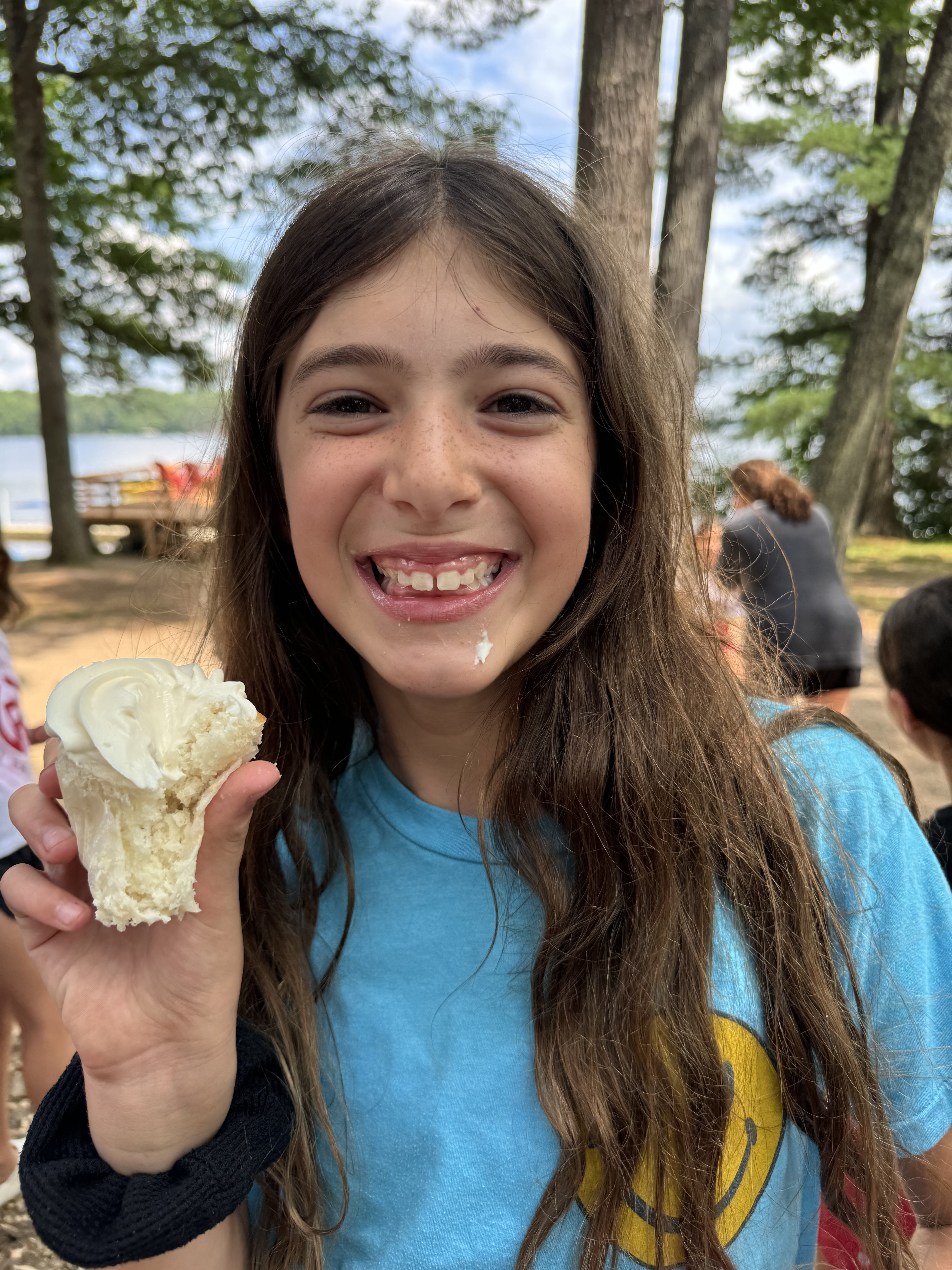 This morning we had activity rotations- age groups went tubing, played nucomb, tried out for the play, played gaga and enjoyed some time at outdoor cooking. It was awesome to see camp so lively- campers excitedly scampering around CRC enjoying the warm weather and one another’s company. After lunch, we had a meeting at the Center Fire Circle where new campers bit into a cupcake to learn if they were officially members of the Tan or White Team…both teams were going crazy as they learned who their newest members were. This afternoon we had a combo of age group activities and activity sign-ups. While not signing up for activities, campers waterskied, made s’mores cookies in cooking, played on the blob and competed in trampball games. It felt like a regular day at camp despite it only being the first full day of the session…it felt good! At dinner we had our first Tan and White cheering session, and it was loud! Campers and staff were quite spirited as they prepared for Sandstorm- the traditional first T&W game of second session.