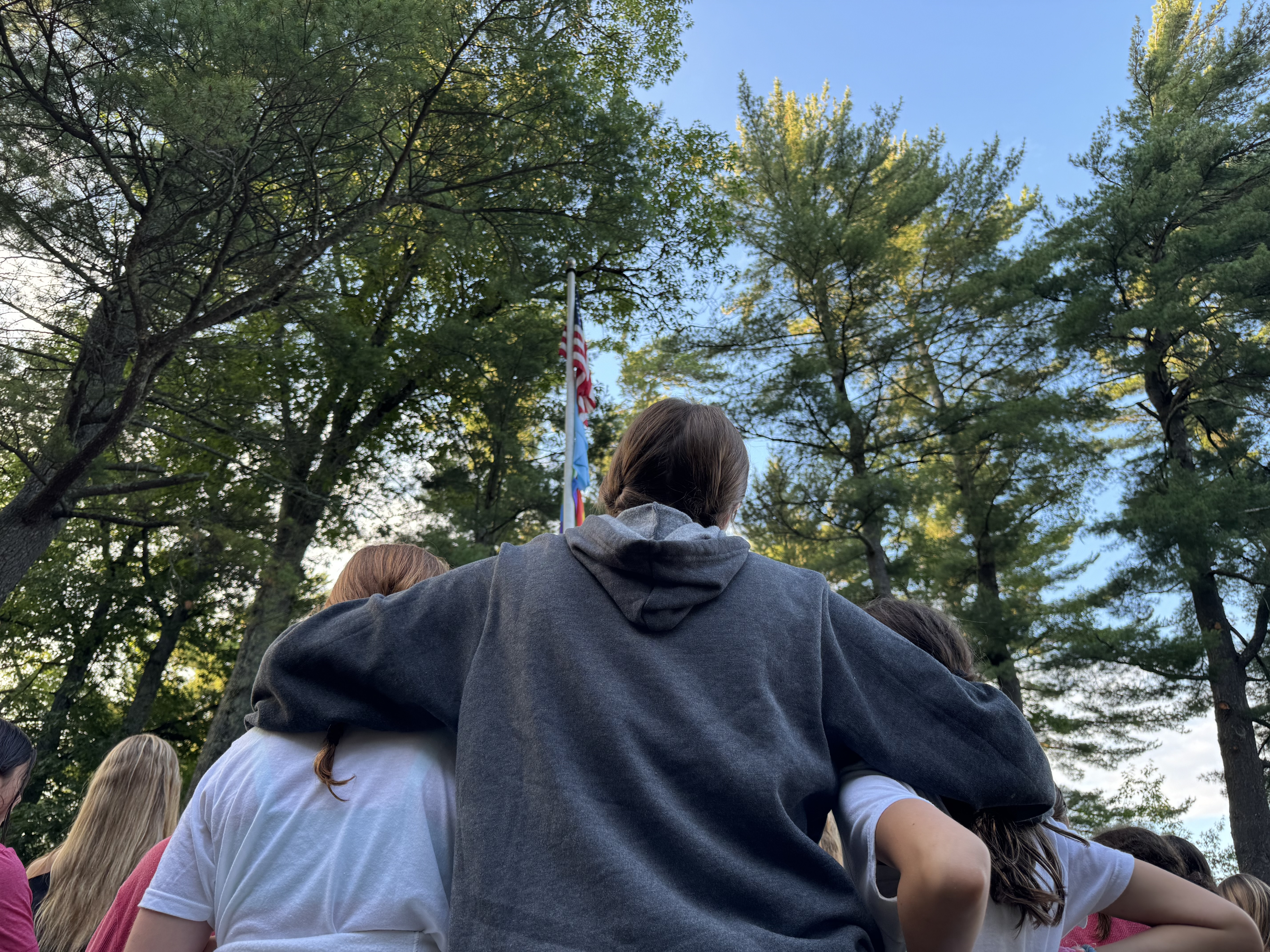As is true on all Friday nights, the real excitement came post-dinner. The happiness all began in my office when a sweet collection of humans were just chilling on my couch. Ellie Wise, Kayleigh Dyble, Logan W, Jada C and Sage L were chit chatting about life. These eleven year-olds and twenty-something year-olds were just enjoying each other’s company, once again proving that the Chippewa Sisterhood knows no bounds in terms of age. From the Office at the Top of the Hill, we all headed down to the Flag Pole for the start of this evening’s Friday Night Campfire, which began with our traditional Formal Retreat and Flag Program.